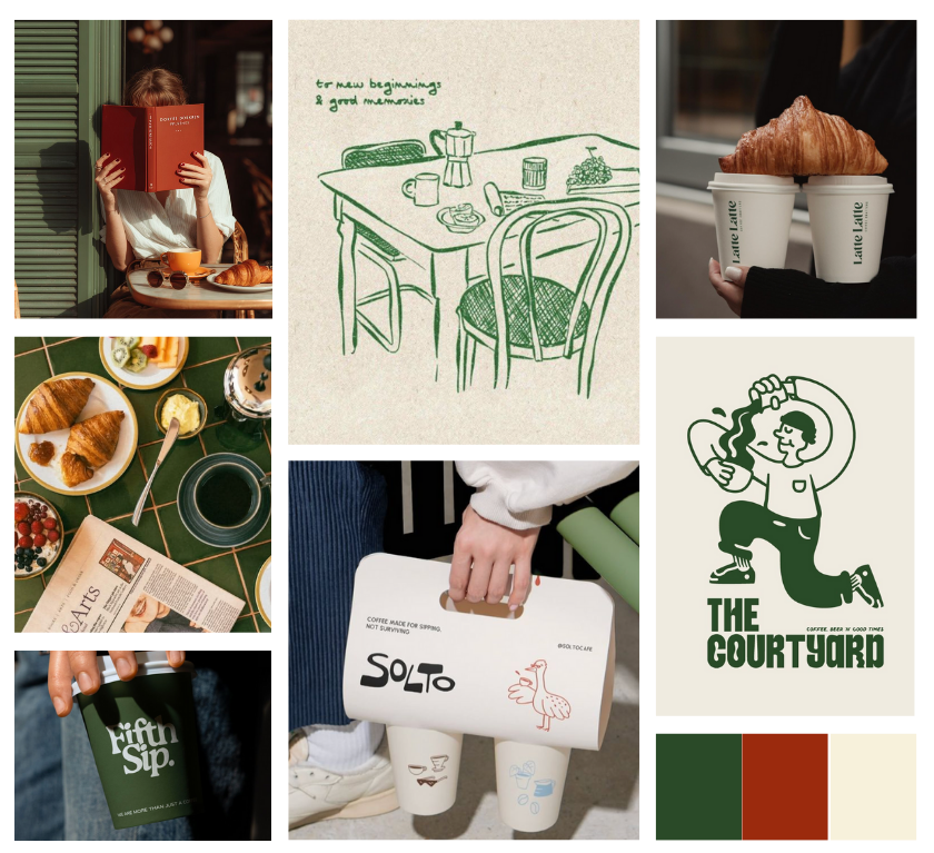 I started by defining the brand’s personality - warm, inviting, and slightly playful. A visual moodboard was created to explore color palettes, café culture references, and textures that reflect comfort and freshness.